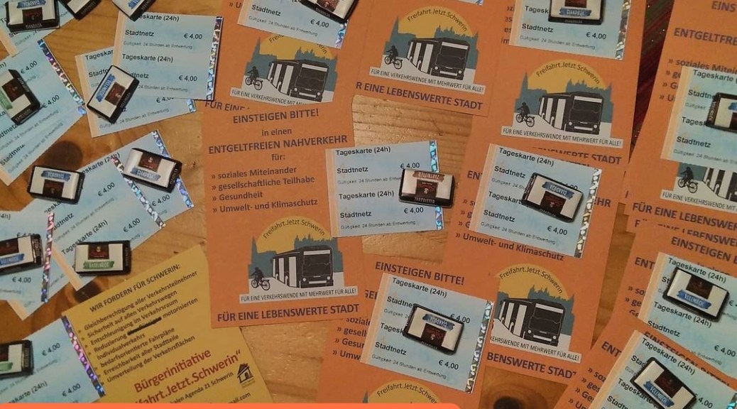 Nach diesem Motto hat sich die Bürgerinitiative Freifahrt.Jetzt.Schwerin etwas besonderes ausgedacht. Durch starke Unterstützung der SWG (www.swg-schwerin.de) und der GTK ( https://www.teilhabe-klimaschutz.de/ sowie weiteren privaten Sponsoren, kamen in kürzester Zeit 800 € zusammen.