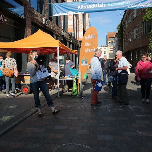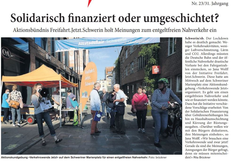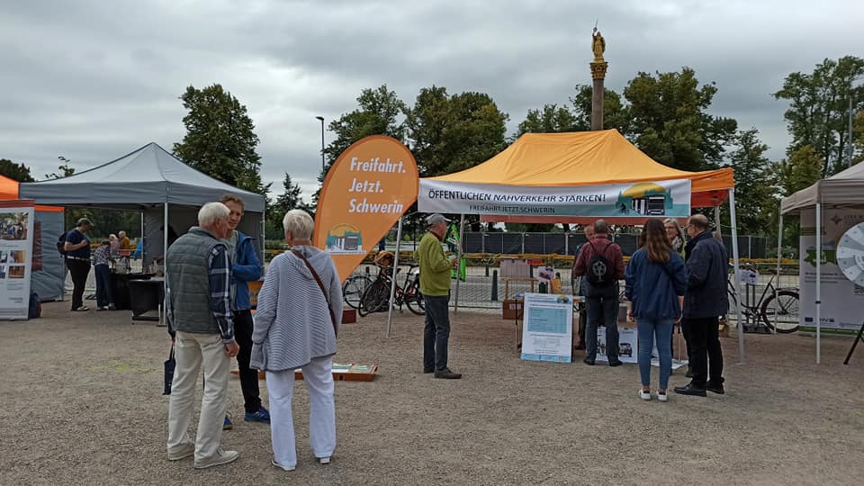 Unsere Bürgerinitiative Freifahrt. Jetzt. Schwerin war dabei und hatte gute Gespräche mit Bürger*innen über die Finanzierung eines entgeltfreien Nahverkehrs. Für mit Bus und Bahn Angereiste gab es Gutscheine für ein Ilka-Eis, dem Bio Markt Karo und dem FKK-Unverpacktladen. Wir bleiben dran und kämpfen weiter für Klima- und soziale Gerechtigkeit!