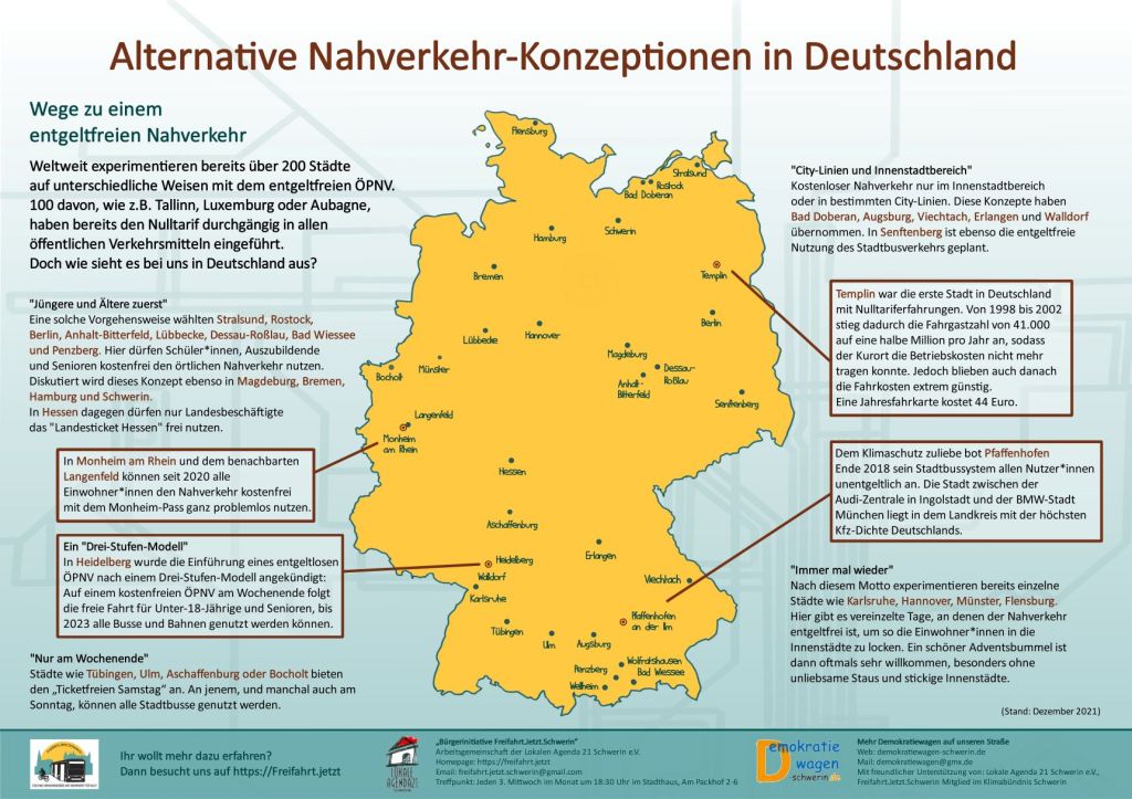 In Schwerin wurde ebenso ein erstes Etappenziel hin zu einem entgeltfreien Nahverkehr für alle Bürger:innen in Schwerin geschafft. Am 6. Dezember 2021 stimmten die Schweriner Stadtvertreter:innen einstimmig für die Kostenlose Schülerbeförderung der 7. Klasse bis 13 ab März 2022. Die entgeltfreie Nutzung des Nahverkehrs für jüngere Schüler:innen wird voraussichtlich am Herbst 2022 angeboten.